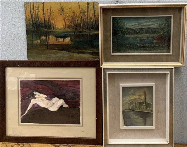 Lotto di quattro dipinti, di autori, soggetti, tecniche e misure diverse, di cui tre in cornici