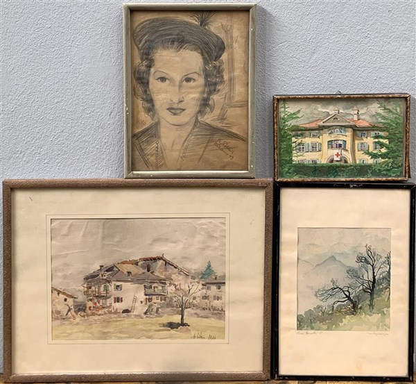 Lotto di tre acquarelli raffiguranti case e paesaggio ed un disegno a matita raffigurante volto, autori e misure diverse