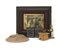Lotto composto da una lampada fiorentina in bronzo, un macinacaffe in legno e metallo, un coperchio in terracotta, un incisione su astra di metallo in cornice e due placche decorate con teste di cani (difetti e mancanze)