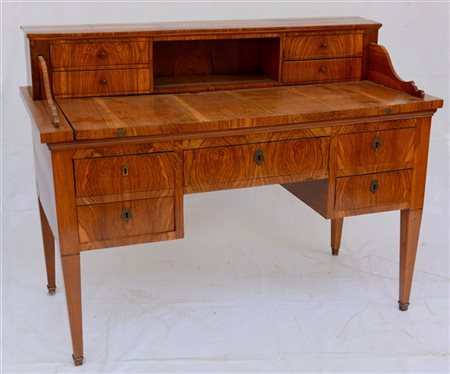 Scrittoio con alzata lastronato con parte superiore a quattro cassettini a vano centrale . Parte inferiore a cinque cassetti, gambe rastremate, secolo XIX (cm 136x104x65) (difetti e mancanze)