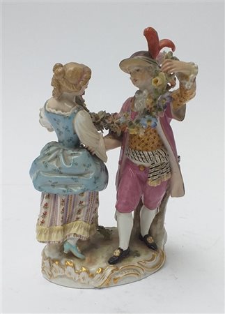 Manifattura di Meissen, prima meta del secolo XIX, "Figure danzanti" gruppo in porcellana policroma (h cm 16) (difetti e restauri)