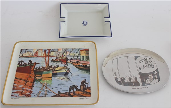Lotto composto da un portacenere di Aldo Navarro per la Camera dei Deputati, un vassoietto di manifattura argentina firmato Quinquela Martin ed un vassoietto svuota tasche in metallo della Siemens Data, il tutto in porcellana e metallo (lievi difetti)