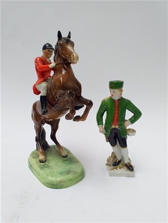 Manifattura tedesca KPM e manifattura inglese Beswick, secoli XIX/XX, lotto di due sculture in porcellana policroma raffiguranti fantino a cavallo e soldao in uniforme verde (h max cm 24) (difetti e restauri)