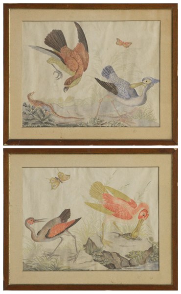 Da Ranieri "Volatili e farfalle in un paesaggio" coppia di acquarelli (cm 45x60