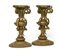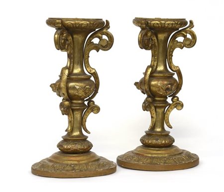 Coppia di basi di forma sagomata in legno intagliato e dorato a volute vegetali e palmette, (h cm 52) (difetti e mancanze)