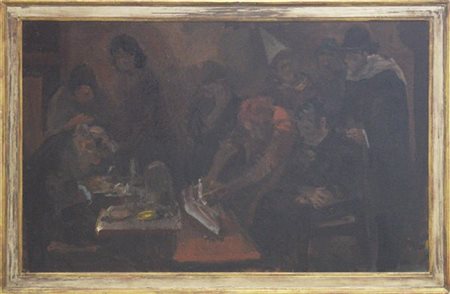 "Scolari" olio su cartone pressato (cm 123,5x198) firmato al retro, in cornice