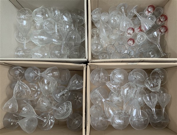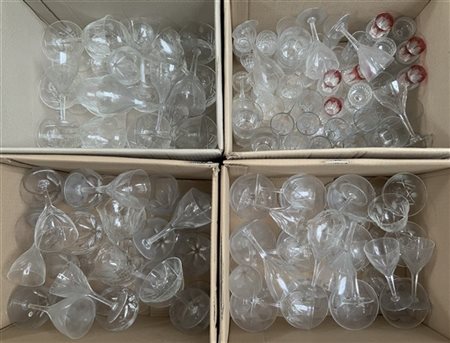 Lotto di quattro cartoni contenenti numerosi bicchieri in cristallo di fatture