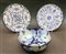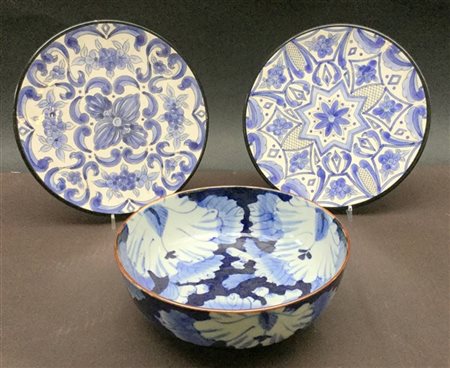 Manifatture diverse, lotto composto da una ciotola orientale e due piatti da parete in ceramica con decori blu (difetti)