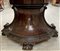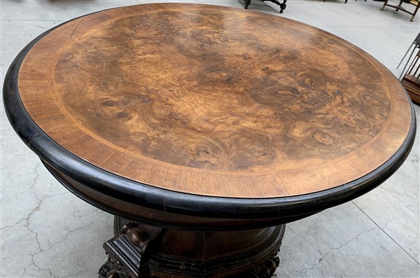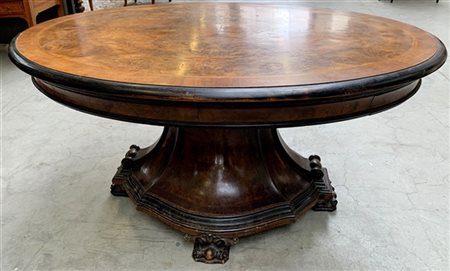 Tavolo da pranzo con piano ovale lastronato in radica e filettato. Sostegno sagomato centrale a plinto in legno intagliato a volute. Munito di due prolunghe (cm 157x81x114)(difetti)