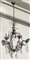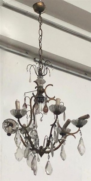 Lampadario a sei fiamme in metallo, bracci a volute, guarnizioni in vetro (h cm 80) (difetti)