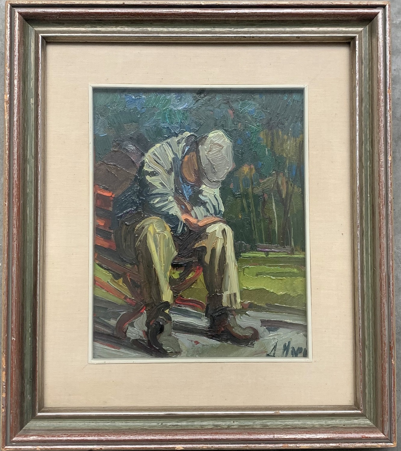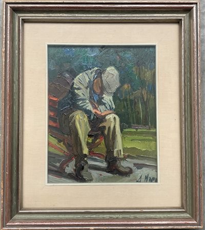 Firma indecifrata "Uomo in un parco" olio su masonite cm 30x24 firmato in basso