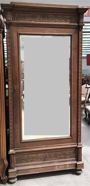 Armadio in noce intagliato a motivi vegetali con un'anta a specchio ed un casse