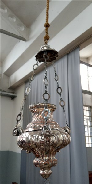 Lampada votiva del secolo XVIII in rame argentato e sbalzato a motivi vegfetali e volute (h cm 64)(montato a luce elettrica in epoca posteriore) (difetti)