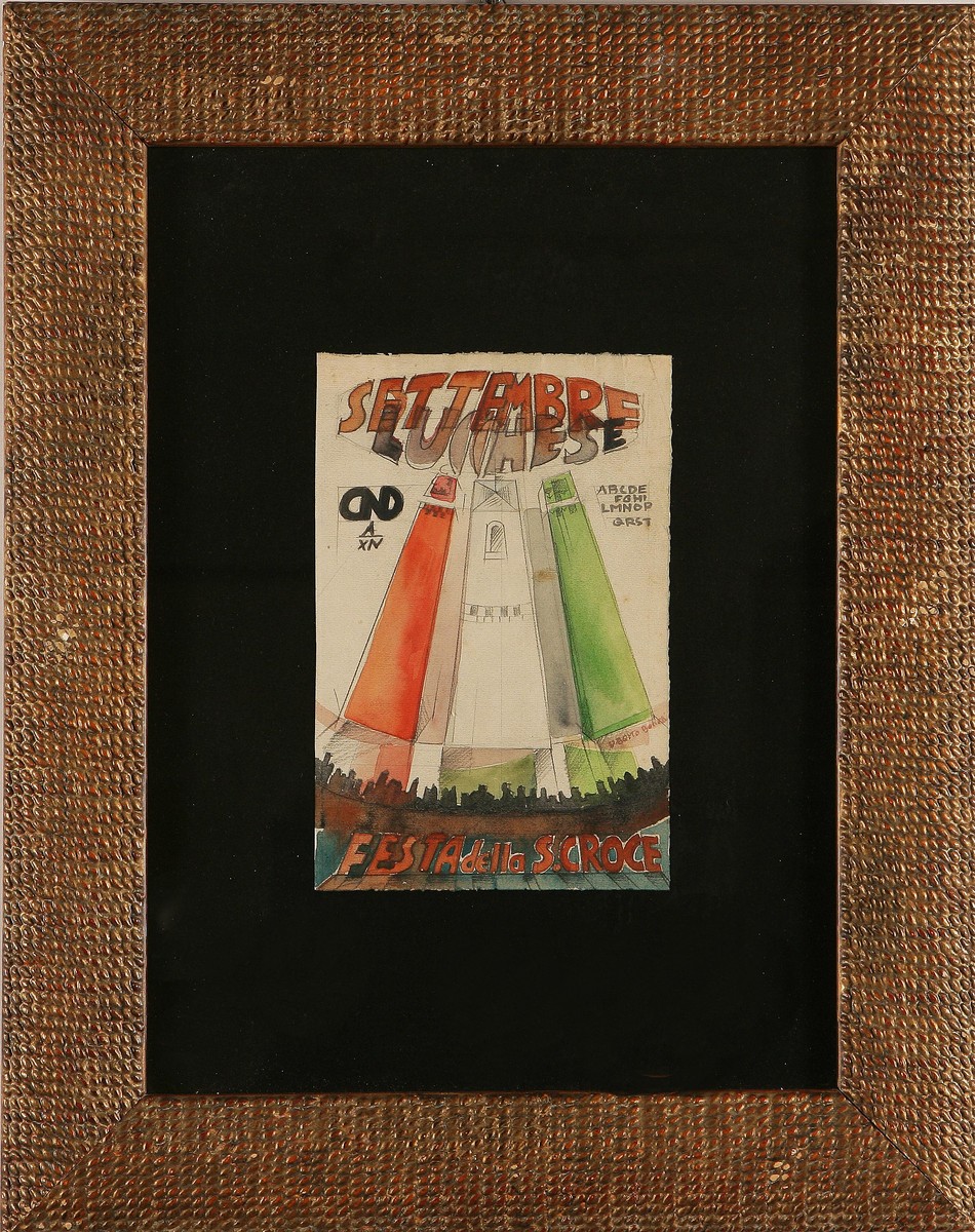 BONETTI UMBERTO (1909 - 1993) Studio per manifesto del settembre lucchese festa della S. Croce, 1936. Tecnica mista su carta. Cm 24x16. Autentica su fotografia a cura di Adriana Bonetti. Opera pubblicata sul catalogo (allegato all'opera) della nostra -Umberto Bonetti, un futurista a Parma-, tenuta presso Mercante in Fiera dal 3 all' 11 ottobre 2009, Parma.