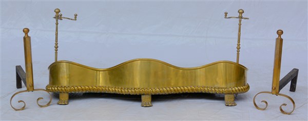 Lotto composto da una ringhiera da camino con porta attrezzi laterali in ottone di forma mossa con piedi ferini e due alari in bronzo e ferro (difetti)