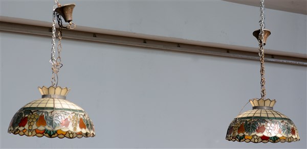 Coppia di lampade a sospensione a una luce in resina policroma decorate a foglie e frutta. Italia, seconda metà secolo XX. (d cm 60) (difetti)
