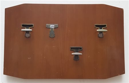 Appendiabiti da parete impiallacciato in legno con ganci richiudibili in fusione di ottone. Italia, anni '50. Marcato a fuoco sul retro. (cm 78x50) (lievi difetti)
