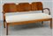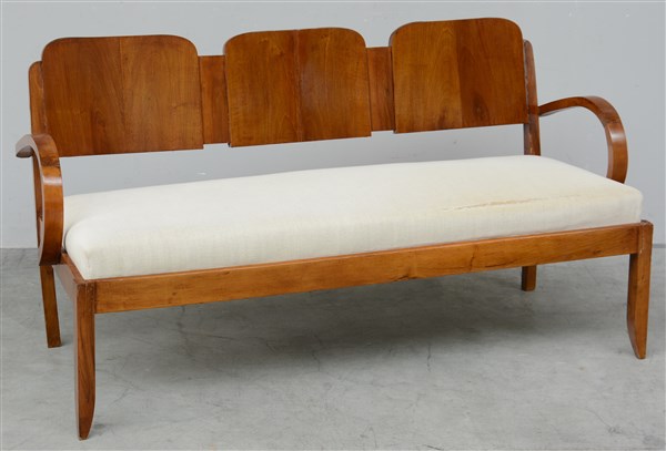 Panchetta a tre posti in stile Novecento con struttura in legno massello, seduta imbottita e rivestita in tessuto bianco. Italia, prima metà secolo XX. (cm 151x80x68) (difetti e restauri)