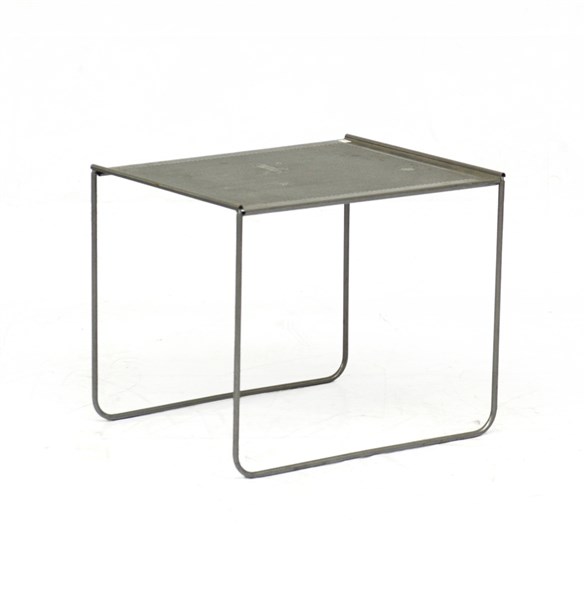 Tavolino da salotto in metallo laccato grigio, piano traforato. Italia, anni '90/2000. (cm 50x41,5x42) (lievi difetti)