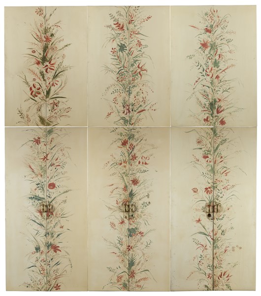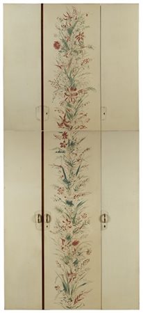 Diciassette ante di armadio laccate beige e dipinte a tempera in policromia con soggetto floreale ascrivibile allo stile di Adriano Spilimbergo, maniglie in ottone. Varedo, anni '40. (difetti)