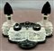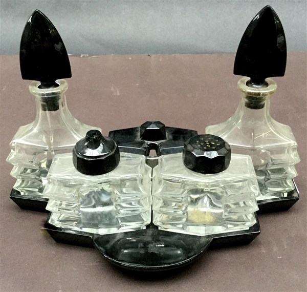 Servizio da tavola déco in vetro soffiato in stampo trasparente incolore, tappi e vassoio in pasta vitrea nera. Repubblica Ceca, anni '30. (gravi difetti e restauri)