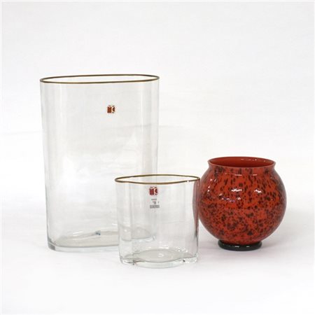 Lotto composto da un vaso globulare in vetro incamiciato rosa e macchie ametista firmato alla base e due in vetro soffiato trasparente incolore con bordo dorato recanti etichetta adesiva "Carlo Moretti Murano". Murano, anni '90/2000. (h max cm 34,5) (lievi difetti)