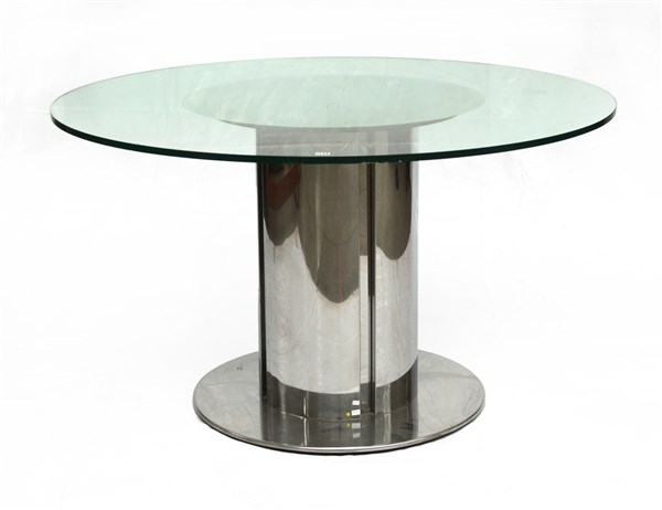 Tavolo da pranzo modello "Cidonio". Produzione Driade, Italia, anni '70. Acciaio cromato, cristallo molato. (h cm 73,5; d cm 129) (difetti)