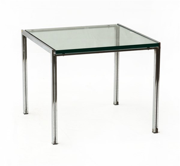 Tavolino da salotto con struttura in metallo cromato e ripiano in cristallo molato. Italia, anni '70/'80. (cm 60x50x60)