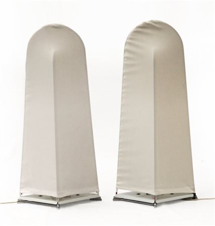 Coppia di lampade da terra modello "Kazuki 2". Produzione Sirrah, Italia, 1976. Struttura in metallo verniciato bianco rivestita di tessuto stretch bianco. (h cm 98) (gravi difetti)