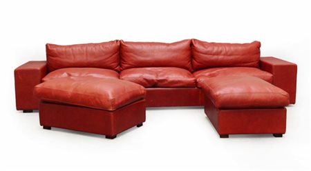 Lotto composto da un divano a sei posti imbottito e rivestito in pelle rossa unito a una coppia di pouf della medesima fattura. Italia, anni '80. (Divano cm 367x90x90; Pouf cm 103x80x50) (lievi difetti)