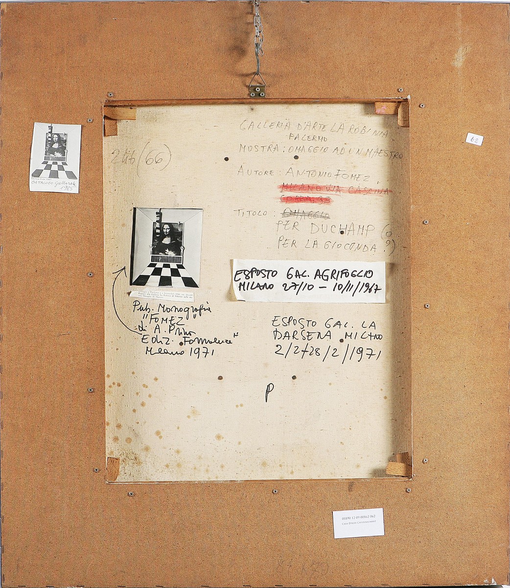FOMEZ ANTONIO (n. 1937) Per Duchamp (o per la Gioconda?), 1966. Tecnica mista su tela. Cm 59x50. Firma e data in basso a sinistra. Al retro cartiglio della -Mostra omaggio ad un maestro- presso la Galleria d'Arte La Robina, Palermo. Cartiglio dell'esposizione presso la Galleria Agrifoglio, Milano (27 ottobre- 10 novembre 1967). Esposto presso Galleria La Darsena, Milano (2 febbraio - 28 febbraio 1971).