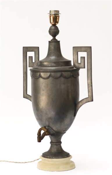 Lampada da tavolo ricavata da antico samovar in peltro a forma di anfora biansa
