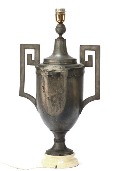 Lampada da tavolo ricavata da antico samovar in peltro a forma di anfora biansata su base in legno (h. tot. cm 64,5)