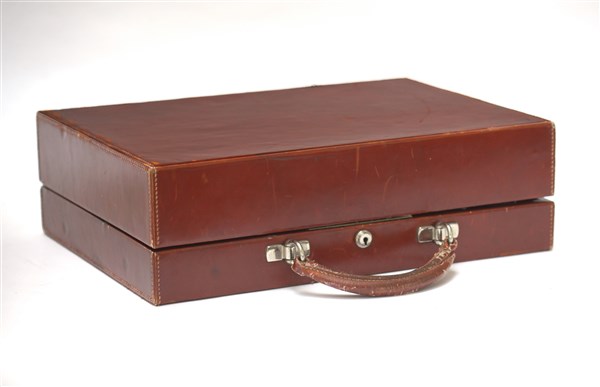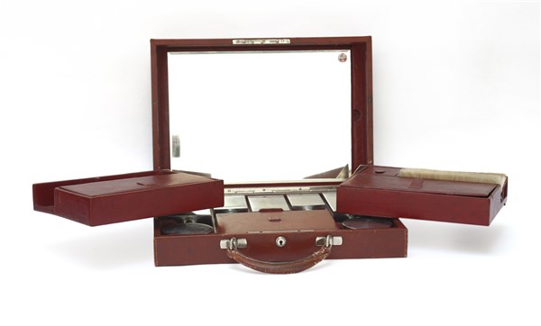 Necessaire da viaggio in cuoio color bruciato contenente numerosi vani, vassoi e contenitori in metallo argentato e specchio nel coperchio (difetti e mancanze)