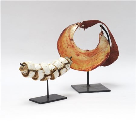 Lotto composto da due oggetti etnici in conchiglie e madreperla poggianti su ba