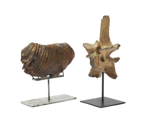 Lotto composto da due fossili di cui una vertebra montati, basi in metallo