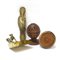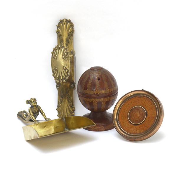 Lotto composto da una palettina in ottone con figura di giullare sul manico, una scatolina in pelle di forma ovoidale del secolo XIX, un calendarietto in ottone e un fermacarte a forma di maniglia