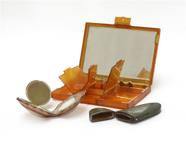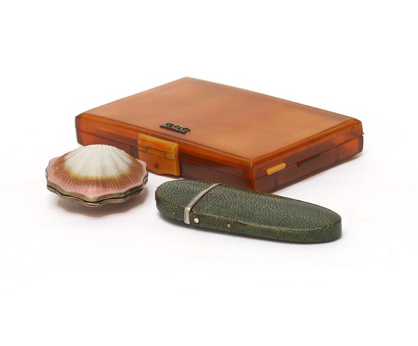 Lotto composto da un portaocchiali in galuchat un portacipria in pasta vitrea e vermeille a forma di conchiglia e una trousse in bachelite cifrata G.G.C. (lievi difetti)