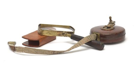 Lotto composto da un metro riavvolgibile e una lente di ingrandimento con fodere in pelle (difetti)