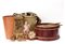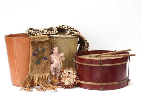 Cartone contenente due cestini, un tamburo e alcuni oggetti etnici (difetti)
