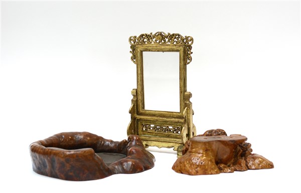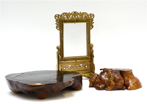 Lotto composto da un piccolo schermo da tavolo con vetro, due basi in radica di manifattura cinese, inizio sec. XX (difetti)