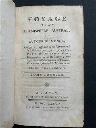 COOK, James. Troisieme Voyage de Cook ou voyage a l'Ocean Pacifique. Paris: Hotel de Thou, 1785. 8vo, 4 vol, [SI AGGIUNGE] Voyage dans l'Hèmisphere austral et autour de monde. Parigi: Hotel de Thou, 1778. (tomi 1,3,4,6). 8vo. Edizioni economiche della prima edizione francese del secondo e terzo viaggio di Cook. Legatura coeva in piena pelle con titoli e numerazione sequenziale in oro al dorso