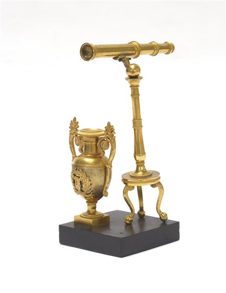 Anfora e telescopio in bronzo dorato montati su base in marmo nero, secolo XIX (h. cm 19) (mancanze)