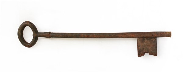 Grande insegna a forma di chiave in legno intagliato e argentato, secolo XIX (lungh. cm 121) (difetti)