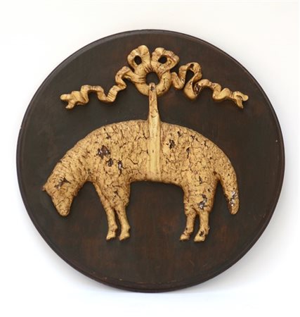 Emblema del Toson d'Oro in legno dorato su pannello tondo. Secolo XIX (d. cm 53,5) (mancanze)