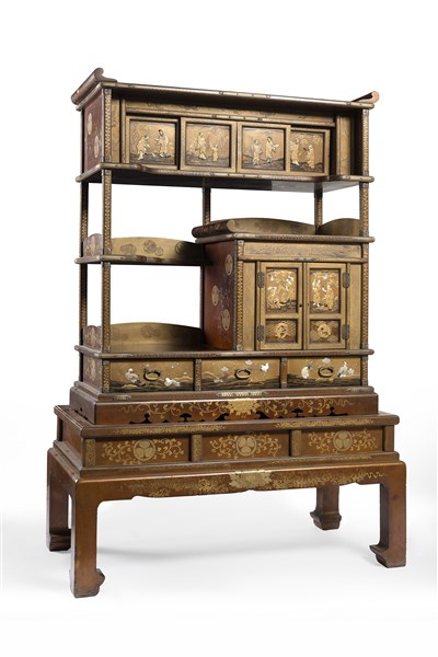 Mobile etagere in legno laccato e decorato a rilievo con figure in avorio e madreperla fronte con ante scorrevoli, vano con due sportelli, ripiani e tre cassetti su base similmente decorata. Giappone, periodo Meiji (cm 138,5x94x49)