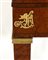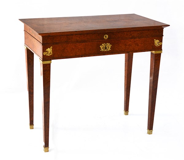 Tavolino da toilette in radica d'olmo con applicazioni in bronzo dorato, cassetto nella fascia, piano apribile celante specchio e scomparto. Gambe rastremate. Secolo XIX (cm 89,5x50x80) (lievi difetti)