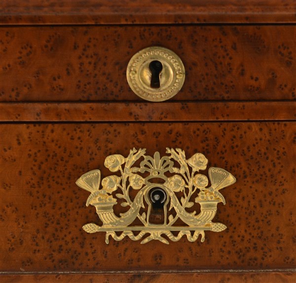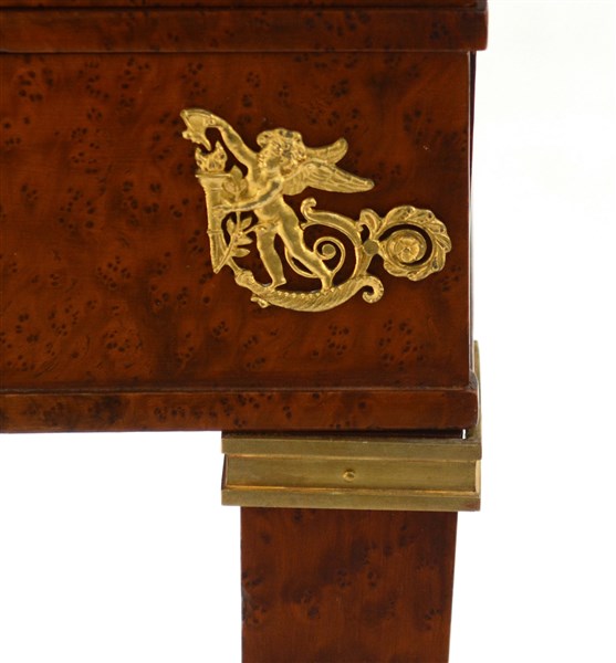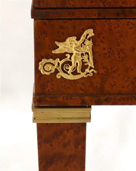 Tavolino da toilette in radica d'olmo con applicazioni in bronzo dorato, casset