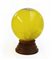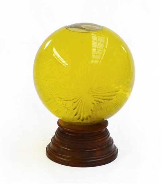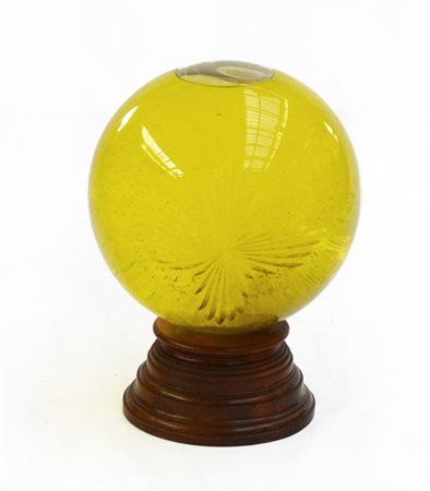 Grande boccia in vetro molato a motivo fogliaceo contenente acqua su base in legno (h. tot cm 50)