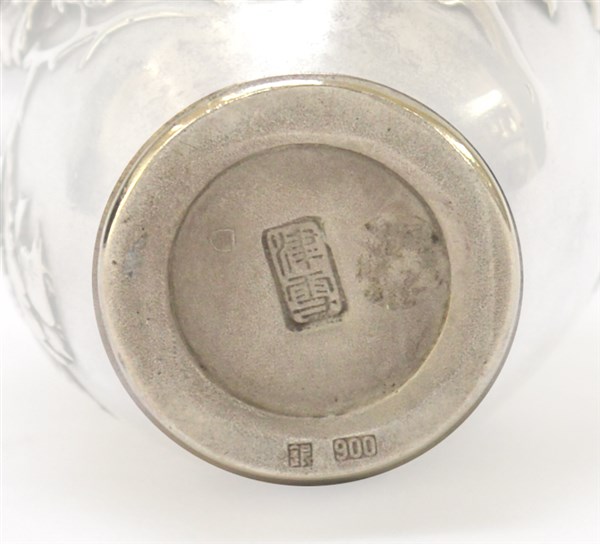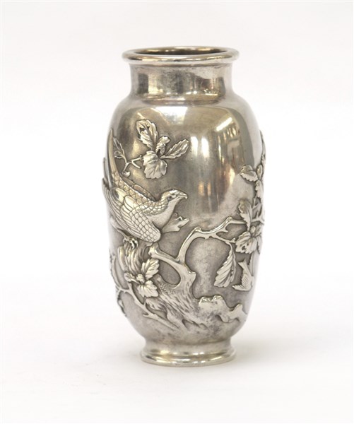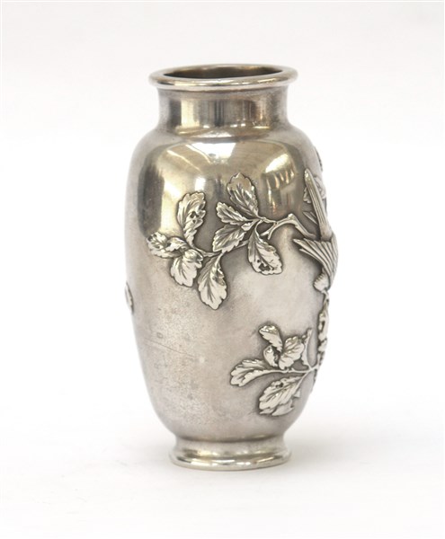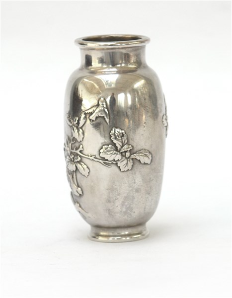 Vasetto in argento decorato con arbusti e rapace in rilievo Giappone, firmato
